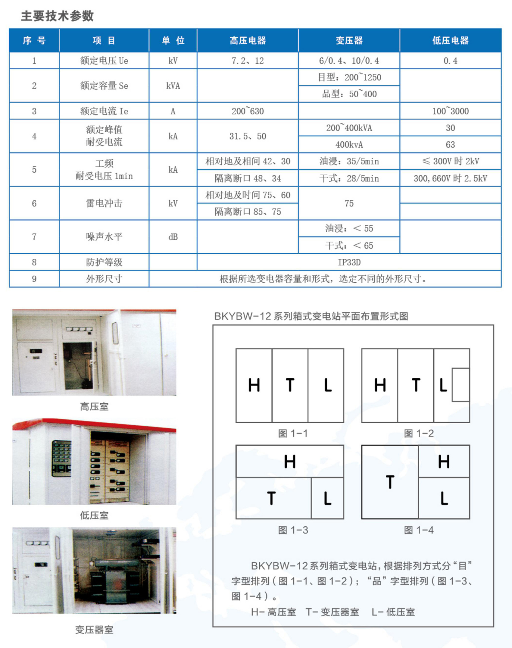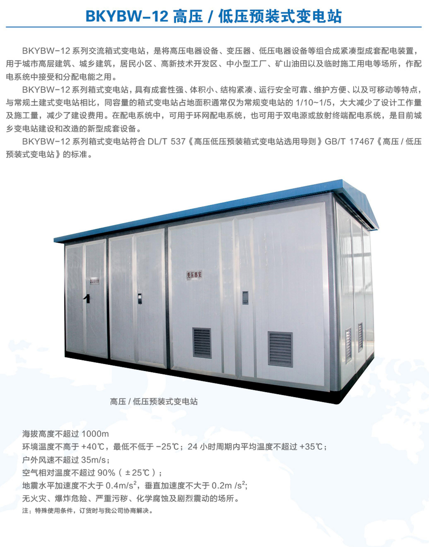 BKYBW-12系列交流箱式變電站,是將高壓電器設備、變壓器、低壓電器設備等組合成緊湊型成套配電裝置,用于城市高層建筑、城鄉(xiāng)建筑,居民小區(qū)、高新技術開發(fā)區(qū)、中小型工廠、礦山油田以及臨時施工用電等場所,作配電系統(tǒng)中接受和分配電能之用。BKYBW-12系列箱式變電站,具有成套性強、體積小、結構緊湊、運行安全可靠、維護方便、以及可移動等特點,與常規(guī)土建式變電站相比,同容量的箱式變電站占地面積通常僅為常規(guī)變電站的1/10~1/5,大大減少了設計工作量及施工量,減少了建設費用。在配電系統(tǒng)中,可用于環(huán)網(wǎng)配電系統(tǒng),也可用于雙電源或放射終端配電系統(tǒng),是目前城鄉(xiāng)變電站建設和改造的新型成套設備。