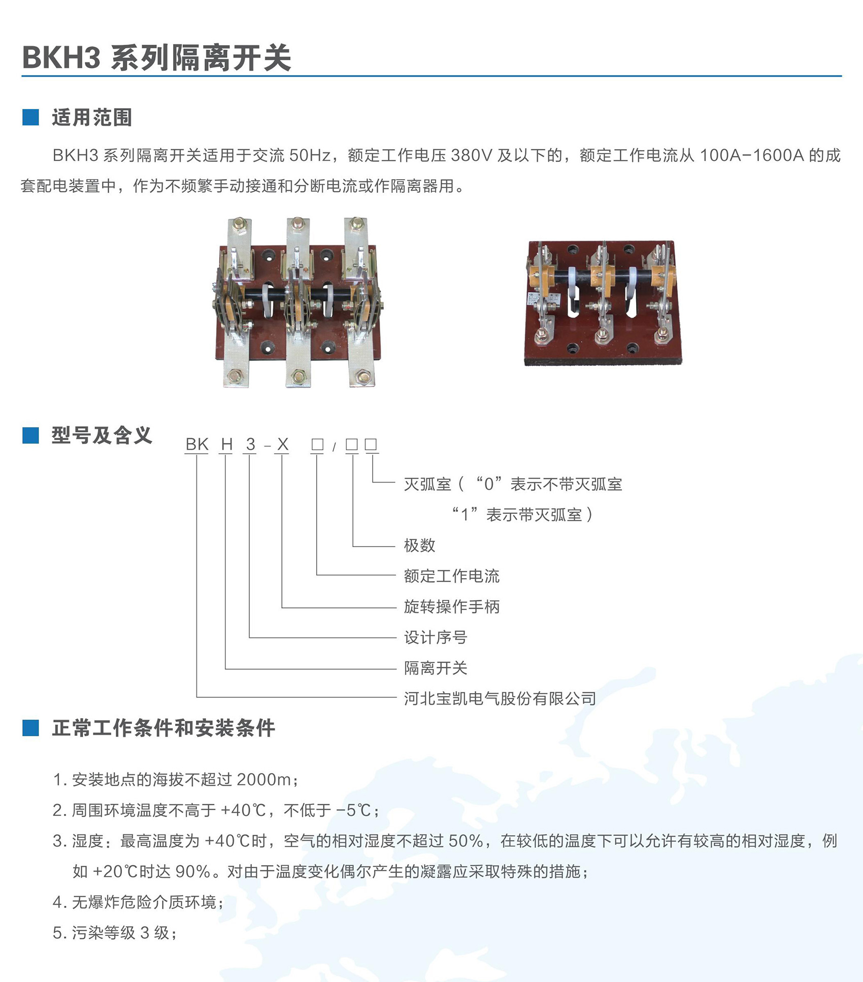 BKH3系列隔離開關(guān)適用于交流50Hz,額定工作電壓380V及以下,額定工作電流100A-1600A的成套配電裝置中,作為不頻繁手動(dòng)接通和分?jǐn)嚯娏骰蜃鞲綦x器用。BKH3系列隔離開關(guān)符合GB/T 14048.3《低壓開關(guān)設(shè)備和控制設(shè)備低壓開關(guān)、隔離器、隔離開關(guān)及熔斷器組合電器》。