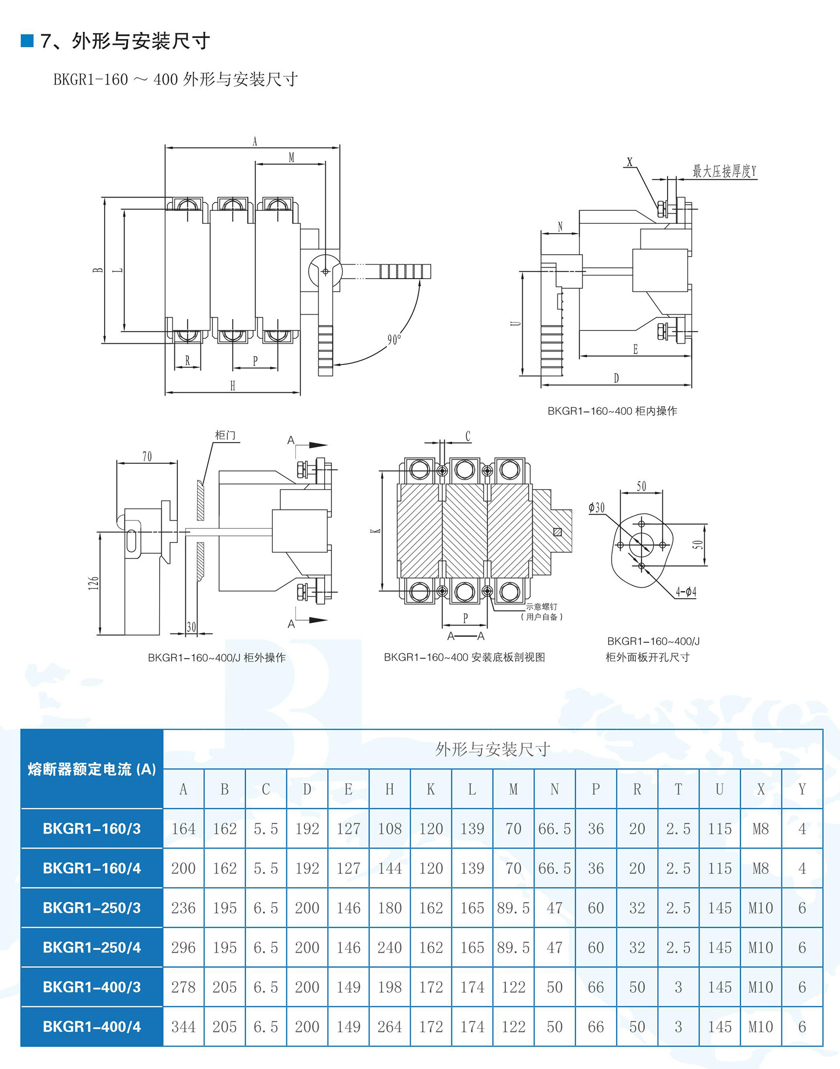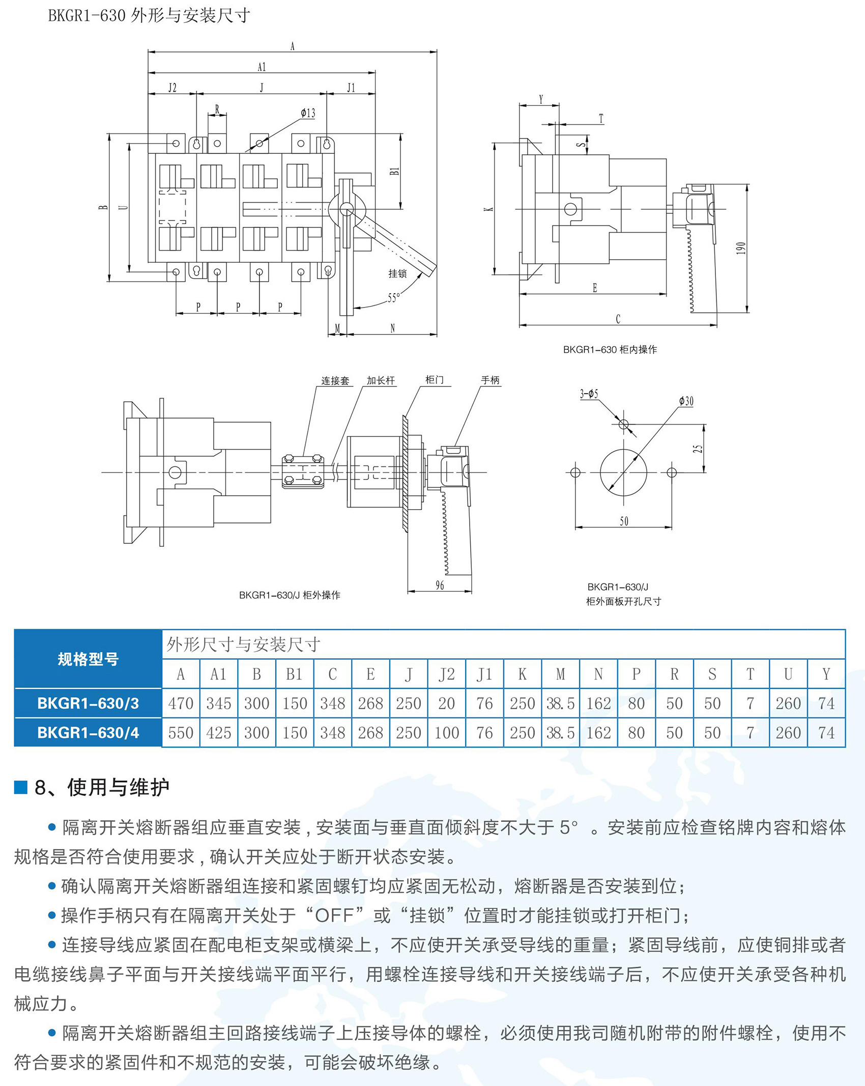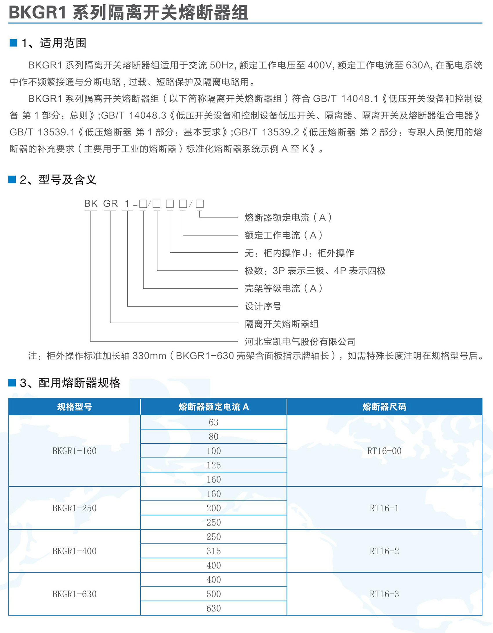 BKGR1系列隔離開關(guān)熔斷器組適用于交流50Hz,額定工作電壓為AC400V,額定工作電流63A-630A的低壓配電或電動(dòng)機(jī)網(wǎng)絡(luò)中,作為不頻繁接通、分?jǐn)嚯娐芳熬€路的隔離之用??商峁┒搪?、過(guò)載保護(hù)功能。BKGR1系列隔離開關(guān)熔斷器組符合GB/T 14048.3《低壓開關(guān)設(shè)備和控制設(shè)備低壓開關(guān)、隔離器、隔離開關(guān)及熔斷器組合電器》。