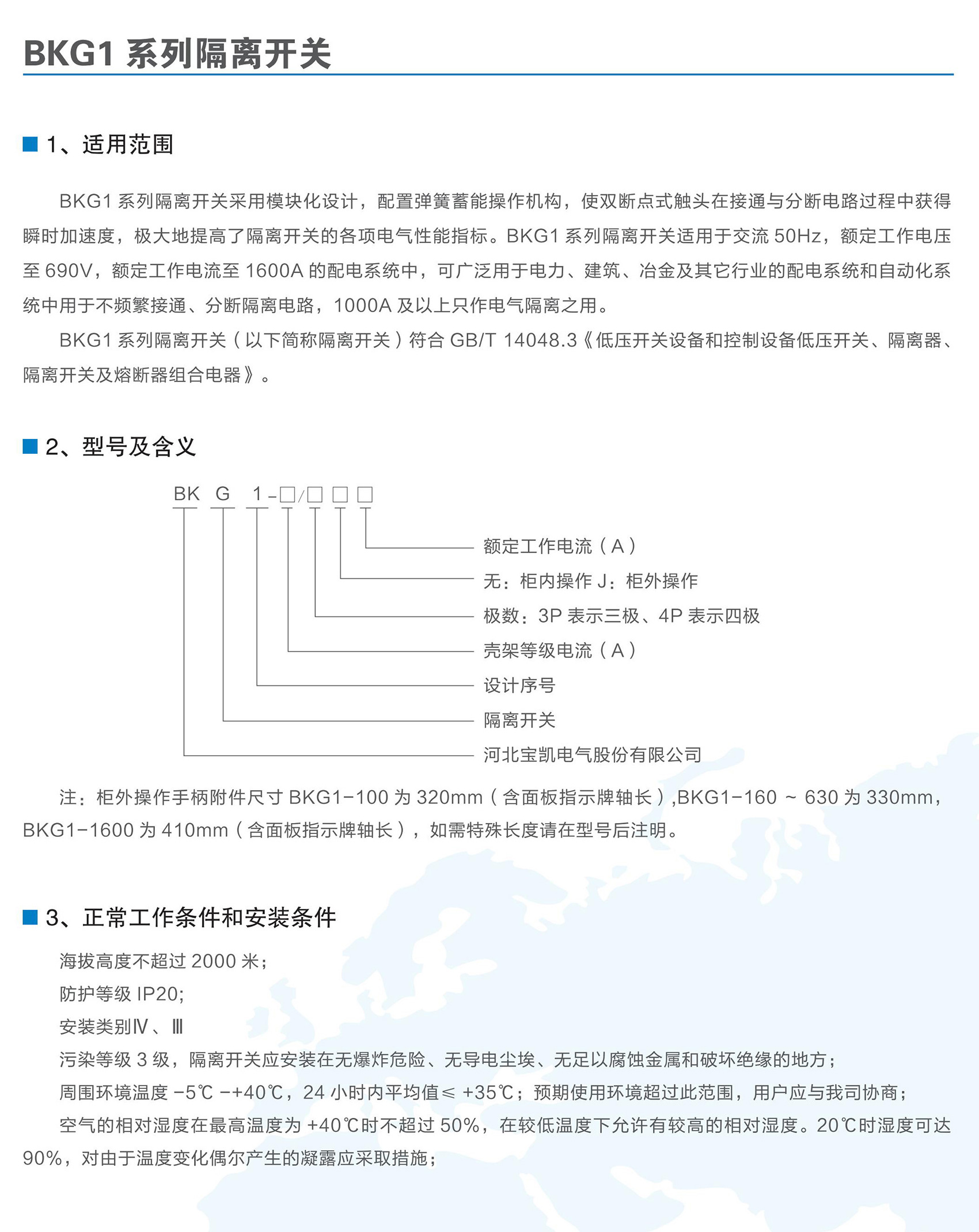 BKG1系列隔離開關(guān)適用于交流50/60Hz,額定工作電壓至AC690V,額定電流為1600A及以下的電力系統(tǒng)中,可廣泛用于電力、建筑、冶金及其它行業(yè)的配電系統(tǒng)和自動化系統(tǒng)中用于不頻繁接通、分?jǐn)嗪透綦x電路之用,額定工作電流1000A及以上產(chǎn)品,只作電氣隔離之用。BKG1系列隔離開關(guān)符合GB/T 14048.3《低壓開關(guān)設(shè)備和控制設(shè)備低壓開關(guān)、隔離器、隔離開關(guān)及熔斷器組合電器》。