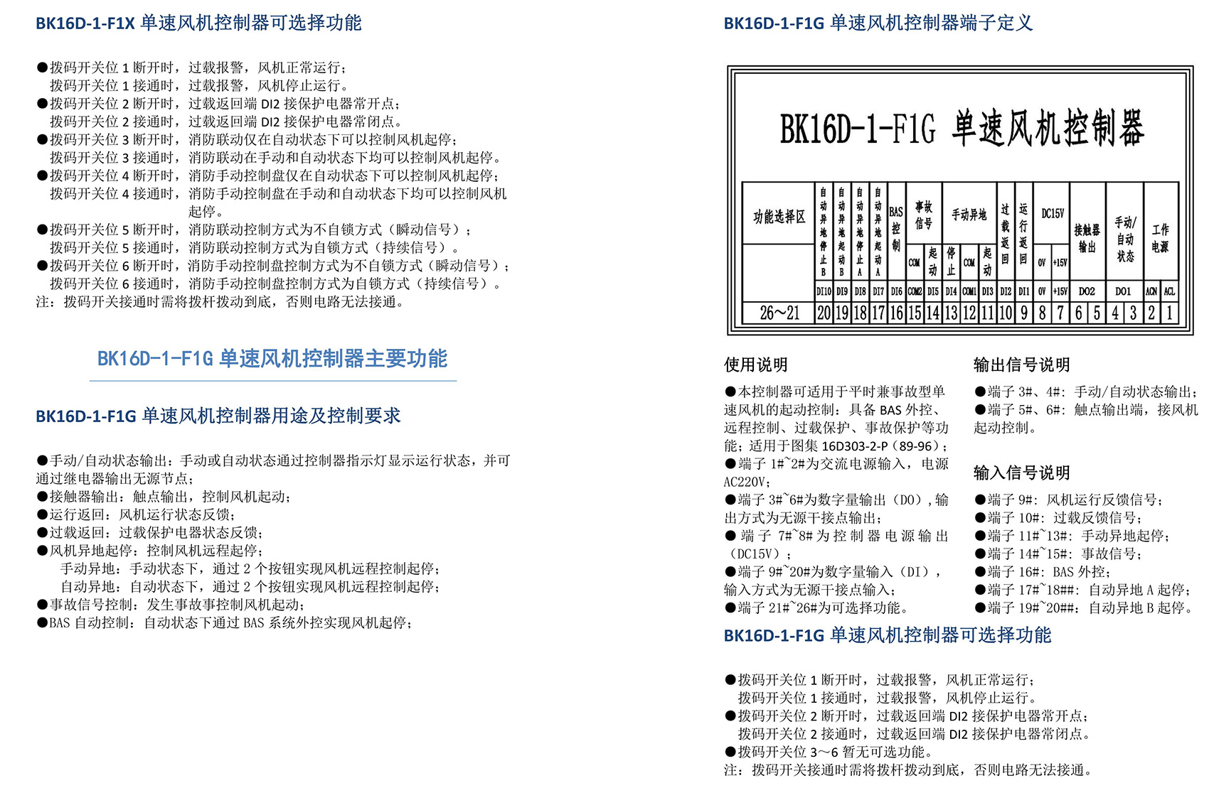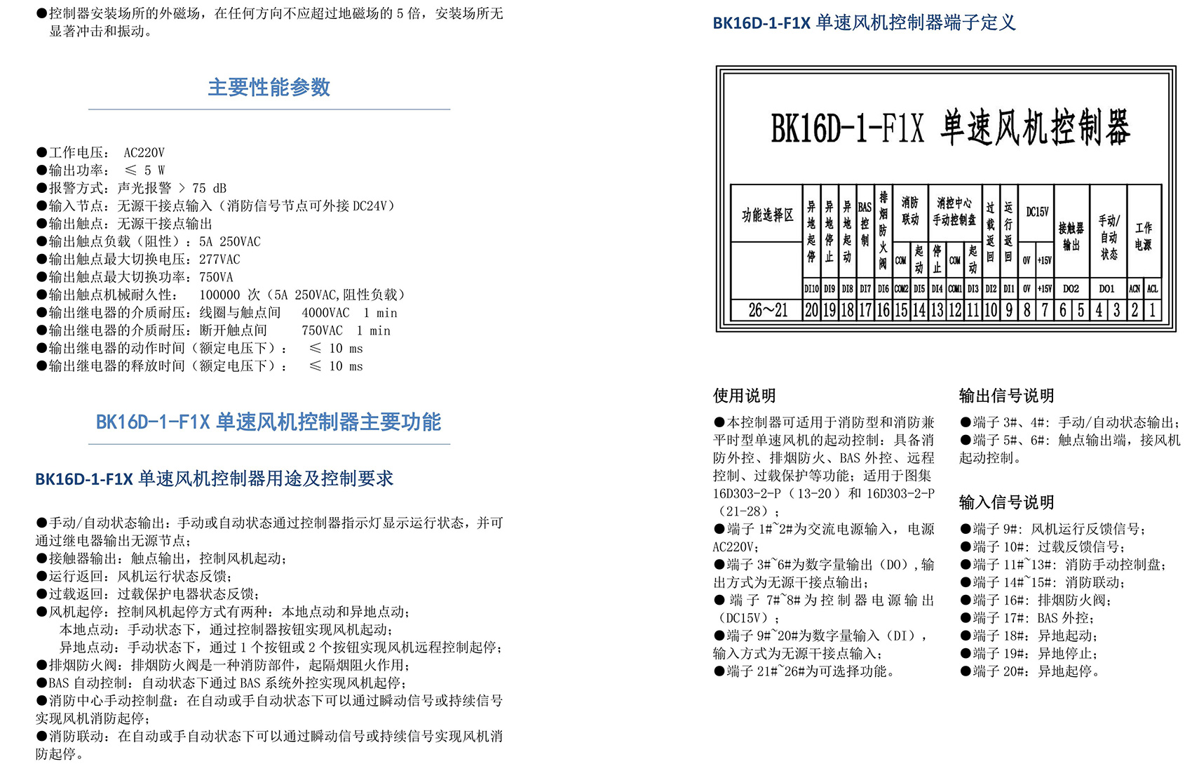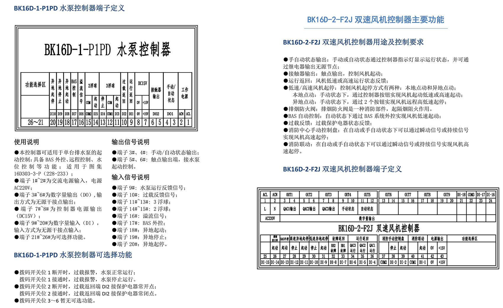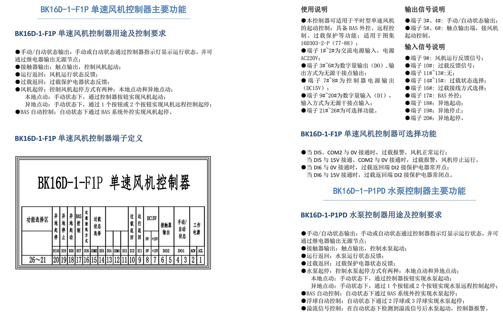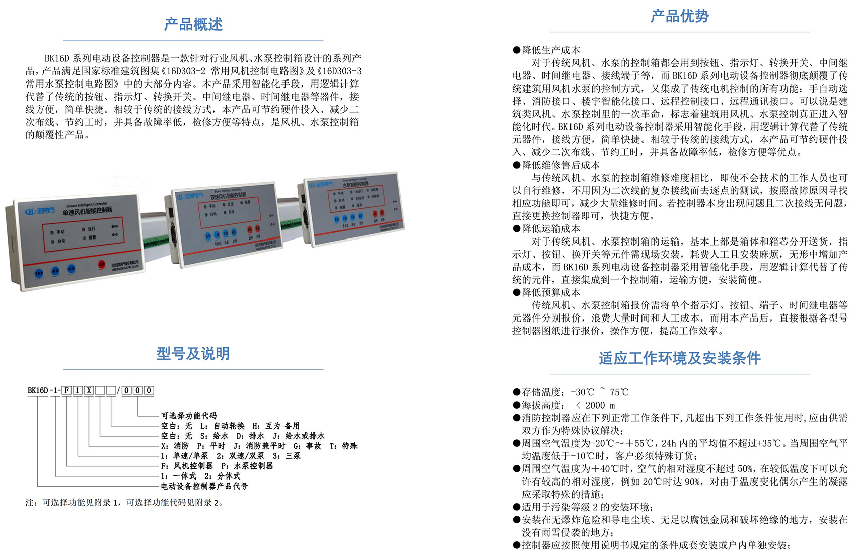 BK16D系列電動設備控制器是一款針對行業(yè)風機水泵控制箱設計的系列產品,產品滿足國家建筑標準設計圖集《16D303-2 常用風機控制電路圖》及《16D303-3 常用水泵控制電路圖》。本產品采用智能化手段,用邏輯計算代替了傳統(tǒng)的按鈕、指示燈、轉換開關、中間繼電器、時間繼電器等器件,接線方便,簡單快捷。相較于傳統(tǒng)的接線方式,本產品可節(jié)約硬件投入、減少二次布線、節(jié)約工時,并具備故障率低,檢修方便。