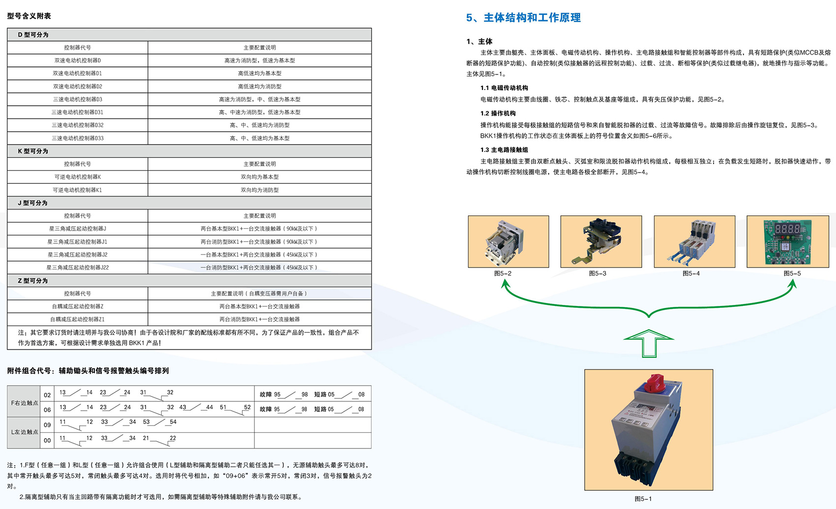 BKK1系列控制與保護開關電器主要用于交流50Hz(60Hz)、額定電壓至690V、額定工作電流自0.4A至125A的電力系統(tǒng)中接通、承載和分斷正常條件(包括規(guī)定的過載條件)下的電流,且能夠接通、承載并分斷規(guī)定的非正常條件(如短路)下的電流。BKK1系列采用模塊化的單一產(chǎn)品結構形式,集成了傳統(tǒng)的斷路器(熔斷器)、接觸器、過載(或過流、斷相)保護繼電器、起動器、隔離器、電機綜合保護器等多種傳統(tǒng)的分離元器件。產(chǎn)品具有遠距離自動控制與就地人力控制兼有的方式進行控制操作的功能,具有協(xié)調(diào)配合的時間-電流保護特性,具有控制與保護自配合、短路后連續(xù)運行,具有分斷能力高,飛弧距離小、壽命長,具有保護整定電流均可調(diào)的特性,操作方便、配套模塊多樣齊全等優(yōu)點,可以實現(xiàn)對電動機負載、配電負載的控制和保護。產(chǎn)品符合GB/T 14048.9《控制與保護開關電器》標準。