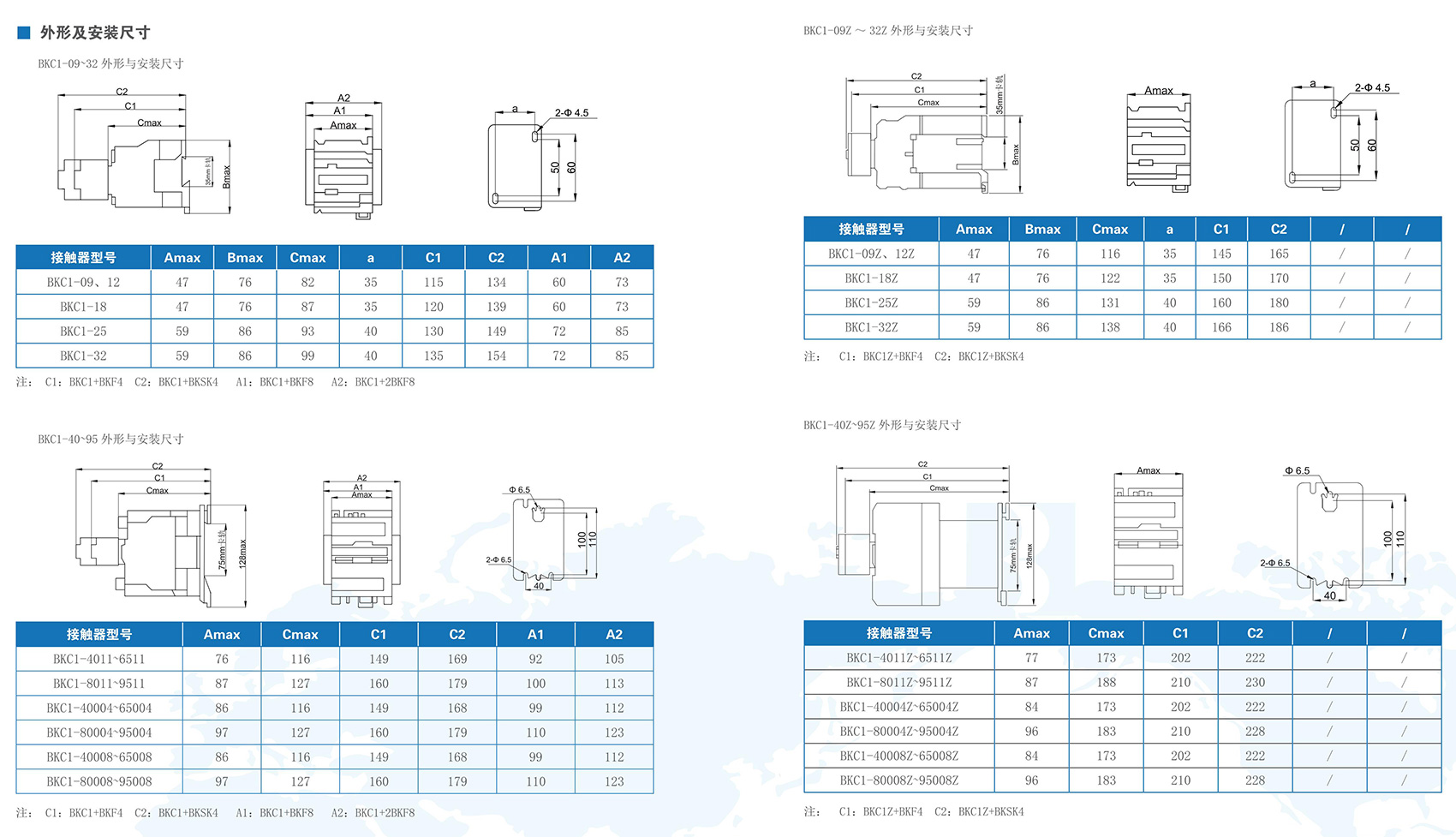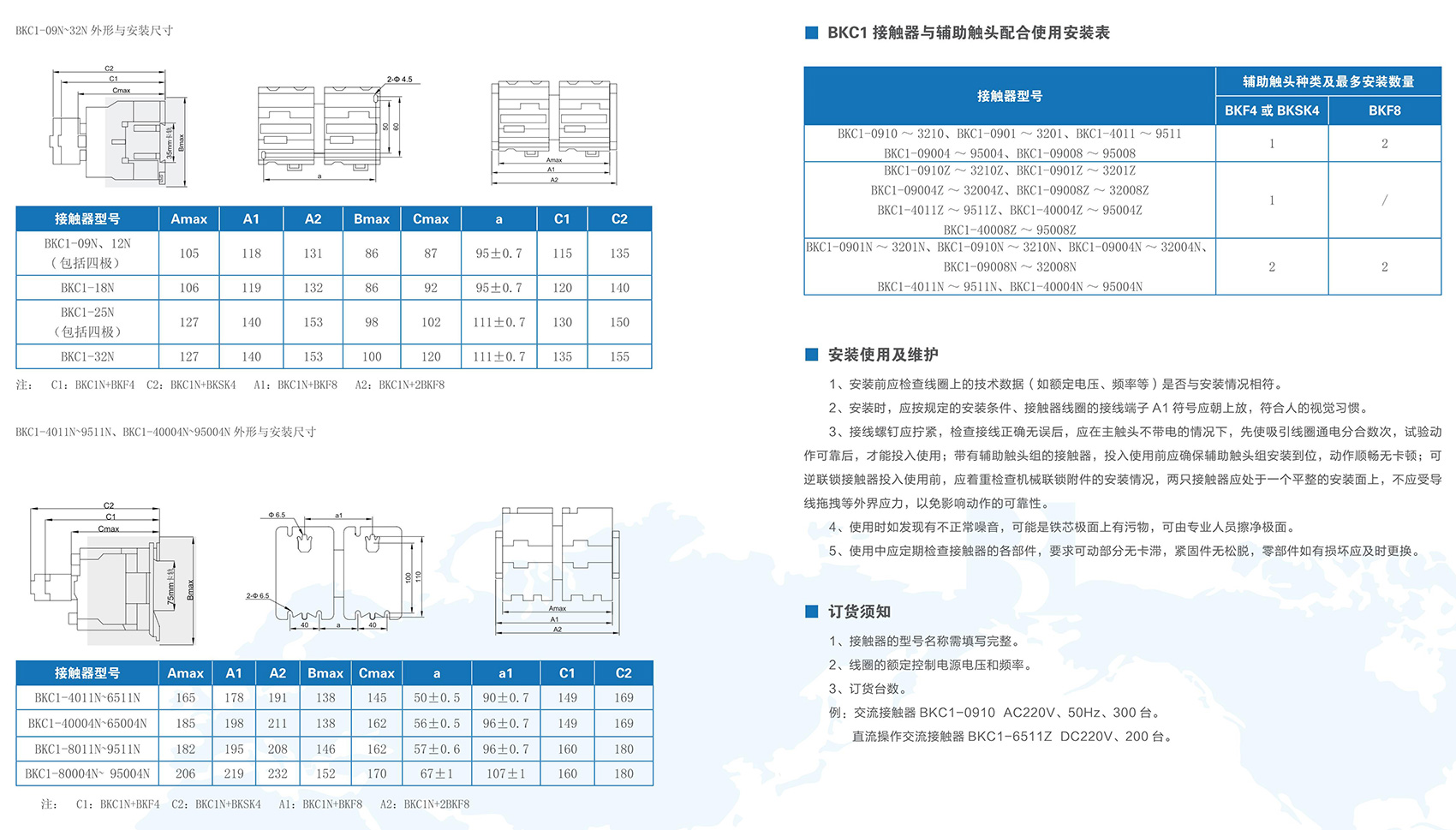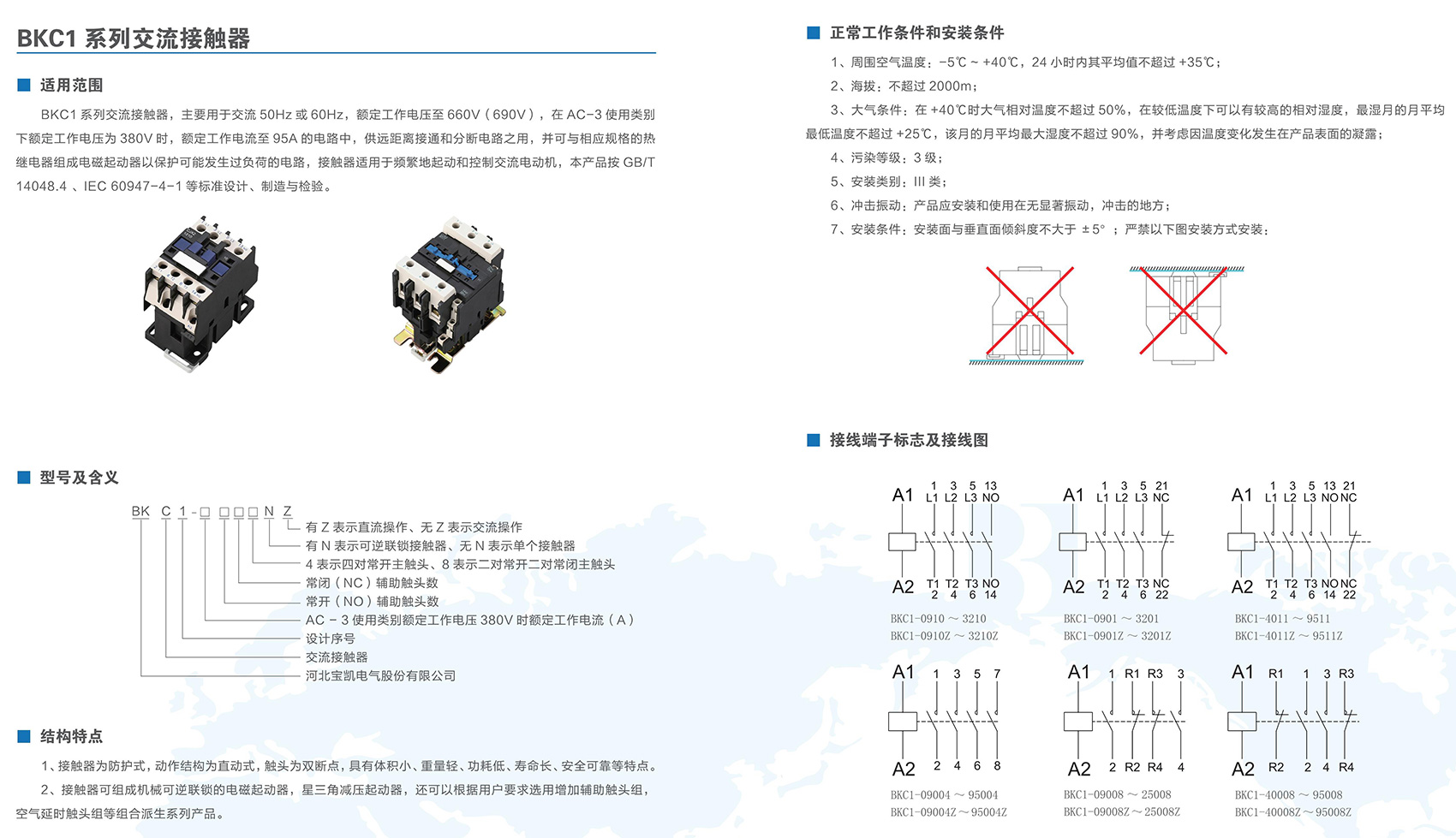 BKC1-09~95系列交流接觸器,主要用于交流50Hz(或60Hz),額定絕緣電壓為690V,在AC-3使用類別下額定工作電壓為380V時額定工作電流為9A~95A的電路中,供遠距離接通與分斷電路及頻繁起動、控制交流電動機;并可與適當(dāng)?shù)臒徇^載繼電器組成電磁起動器,以保護可能發(fā)生過負荷的電路。產(chǎn)品符合標準:IEC 60947-4,GB/T 14048.4,IEC 60947-5,GB/T 14048.5