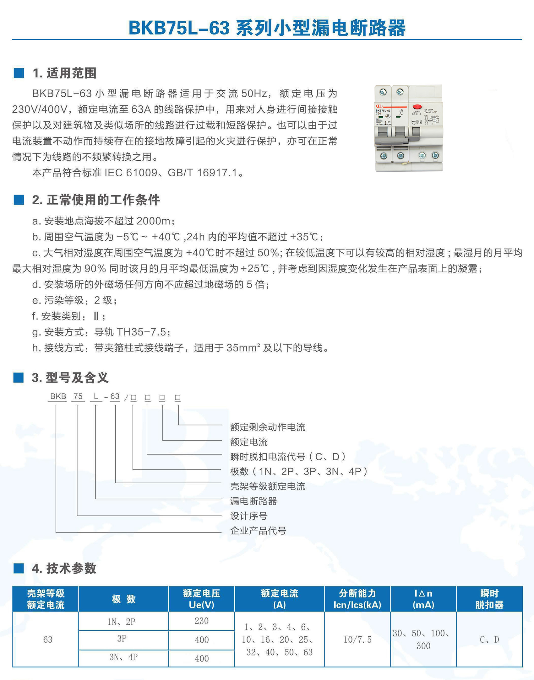 BKB75L-63系列帶剩余電流保護小型斷路器適用于交流50/60Hz、額定電壓至400V,額定電流1~63A 的線路中。作為人身觸電和設(shè)備漏電保護之用,并可用于線路和電氣設(shè)備的過載以及短路保護。在正常情況下亦可用于不頻繁的通斷操作。本產(chǎn)品符合GB/T 16917.1、IEC 61009-1標準。