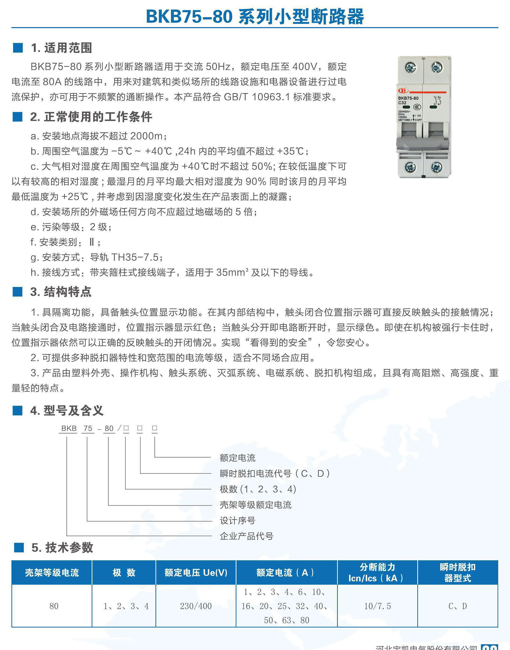 BKB75-80系列小型斷路器適用于交流50Hz,額定電壓至400V,額定電流1~80A,額定絕緣電壓690V的系統(tǒng)線路中。用來(lái)對(duì)建筑電廠、變電站、電信、交通、冶金、工礦業(yè)等及類(lèi)似場(chǎng)所的系統(tǒng)線路、電氣設(shè)備進(jìn)行過(guò)電流保護(hù),也可以用于不頻繁的通斷操作。適用于非專(zhuān)業(yè)人員使用且不需要進(jìn)行維護(hù)。本產(chǎn)品符合GB/T 10963.1、IEC 60898-1標(biāo)準(zhǔn)。