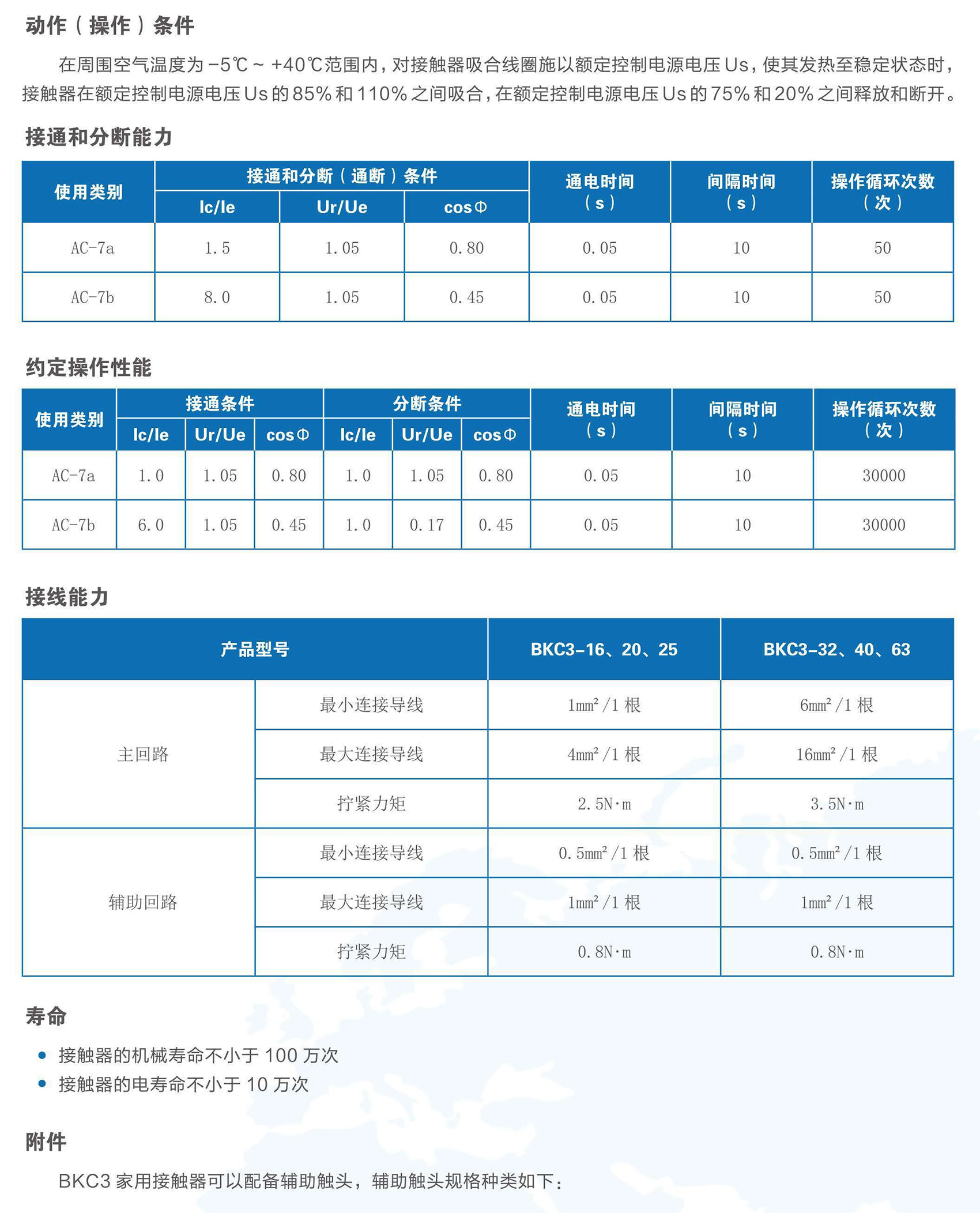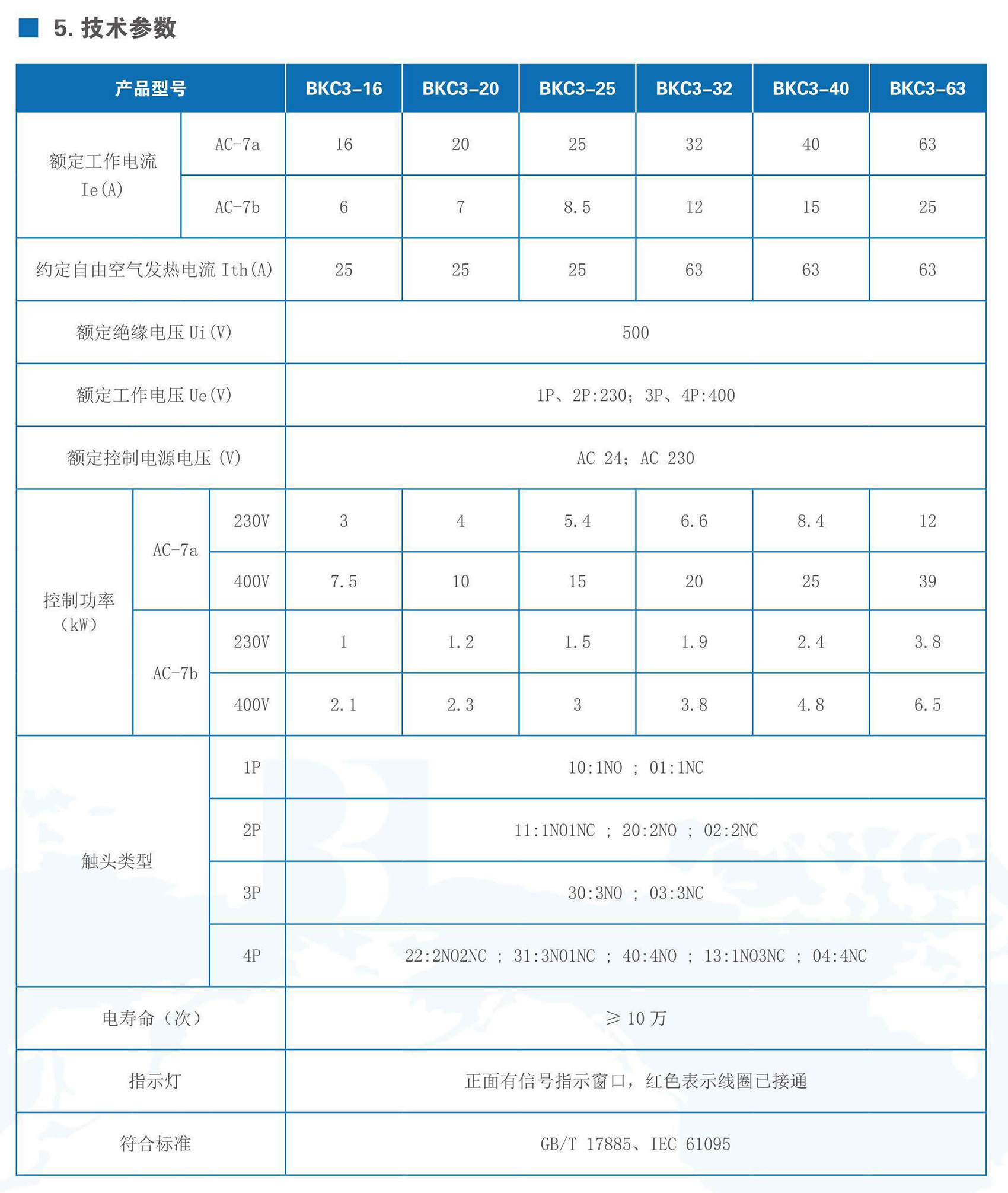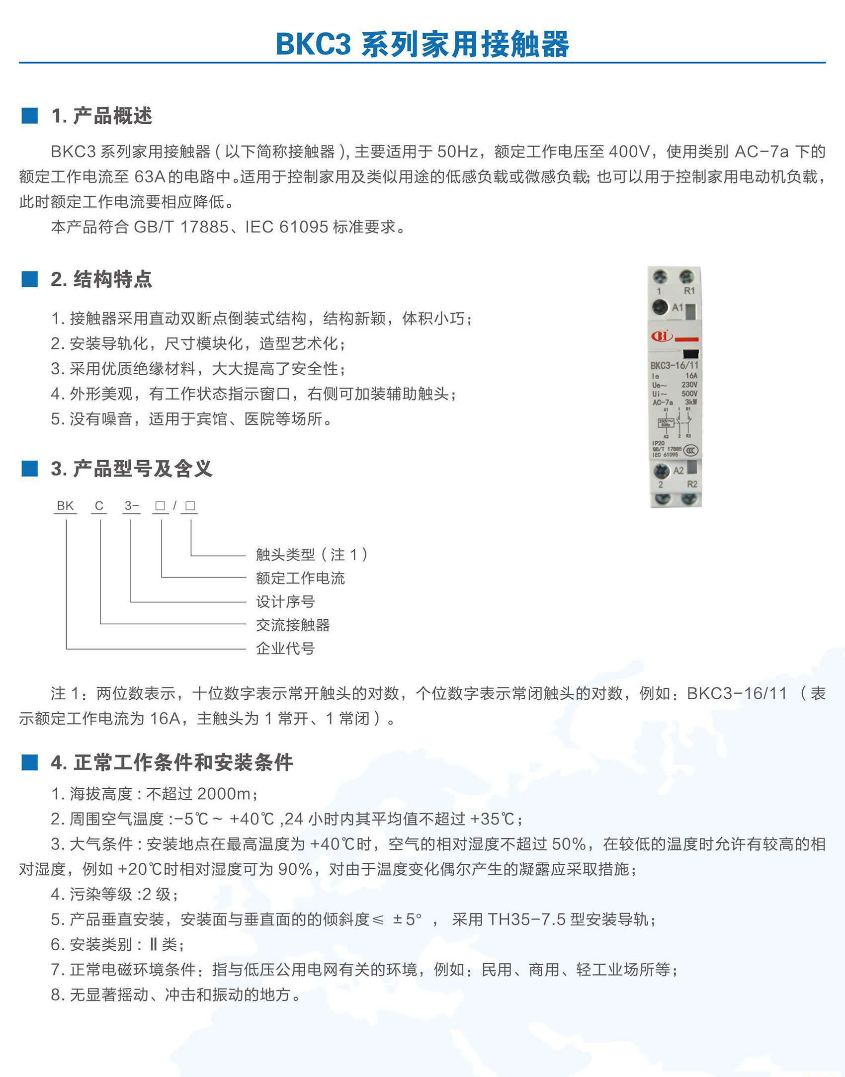 BKC3系列家用接觸器適用于交流50Hz,額定工作電壓至400V,使用類別 AC-7a下的額定工作電流至63A,用于控制家用及類似用途的低感或微感負(fù)載,也可以用于控制家用電動(dòng)機(jī)負(fù)載。本產(chǎn)品應(yīng)用于賓館、公寓等場(chǎng)所,實(shí)現(xiàn)自動(dòng)化控制功能。產(chǎn)品符合GB/T 17885、IEC 61095標(biāo)準(zhǔn)。